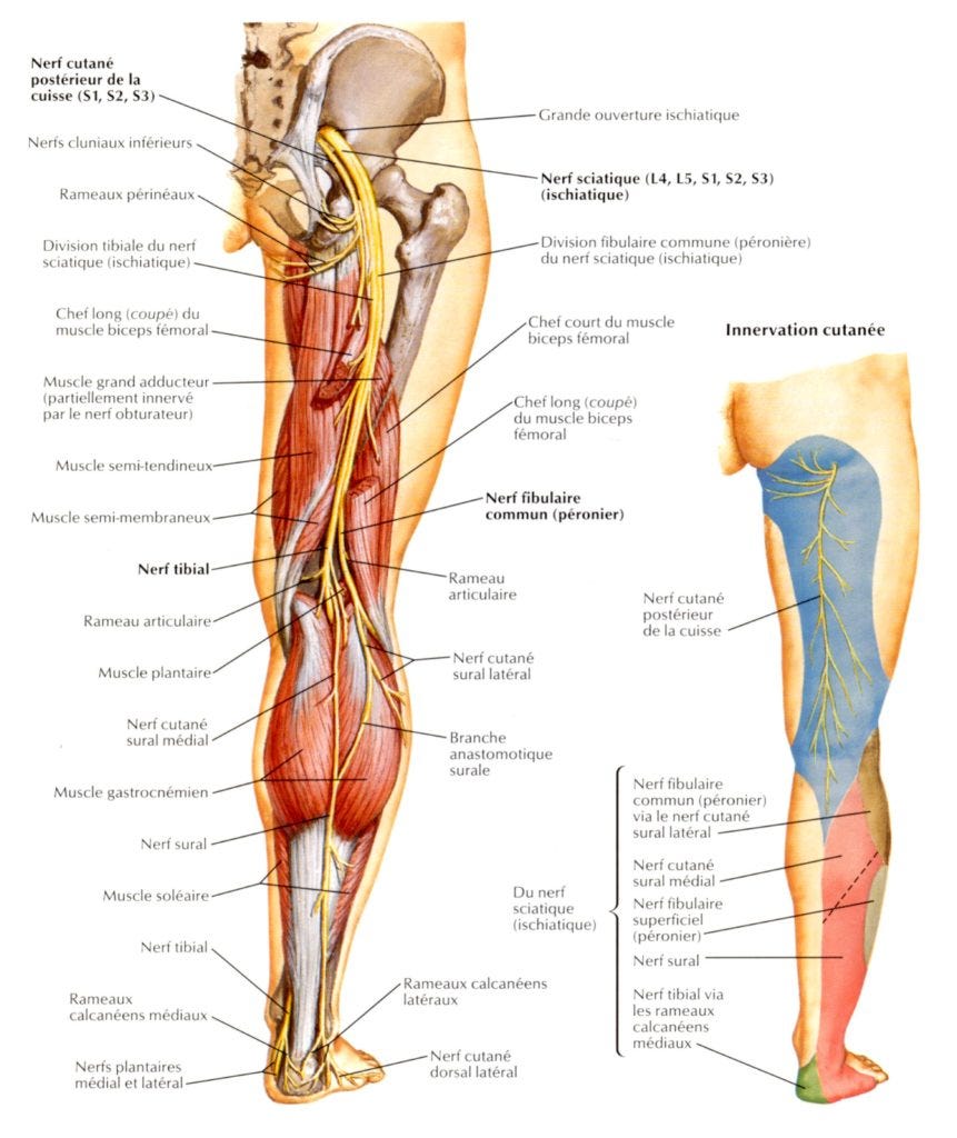 Le nerf sciatique quitte la région lombaire en passant par la grande ouverture ischiatique et poursuit son trajet à l’arrière de la cuisse jusqu’au pied.